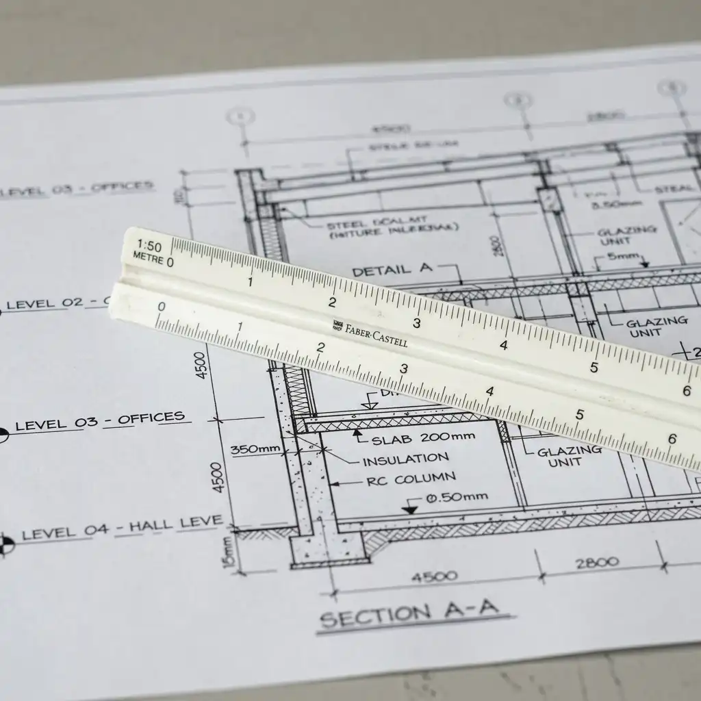 A scale rule is a three-sided rod with scales marked at different ratios. Common metric scales include 1:1, 1:5, 1:10, 1:20, 1:50, 1:100, 1:200, 1:500, and 1:1250. Imperial scale rules (used in the US) show 3″=1′-0″, 1/4″=1′-0″, 1/8″=1′-0″ and more. Knowing how to use a scale rule quickly and accurately is a non-negotiable professional skill.
